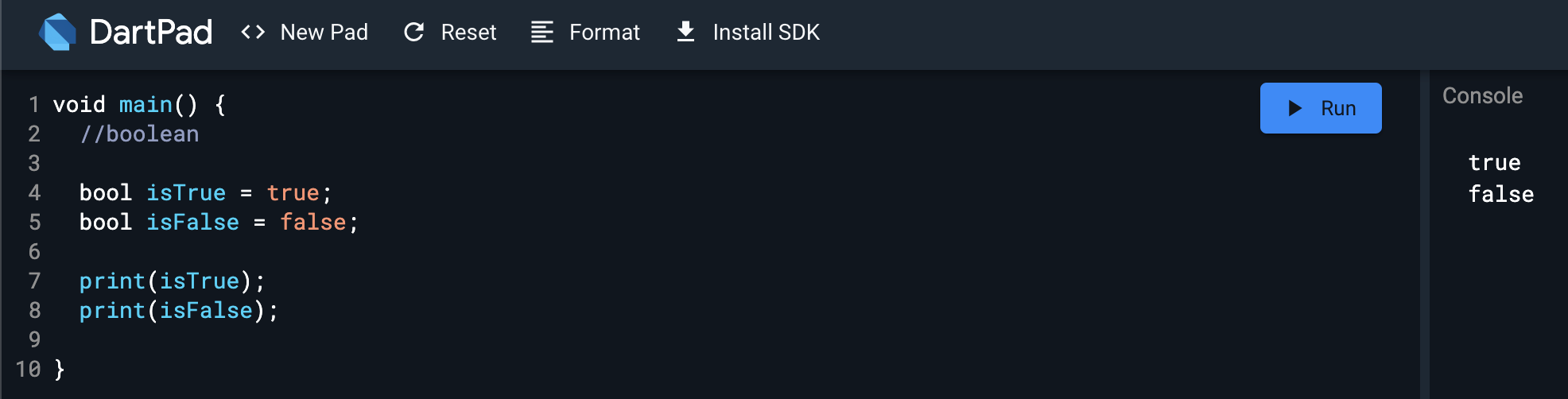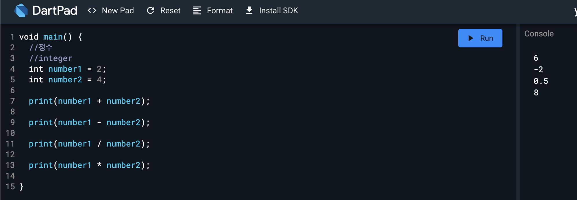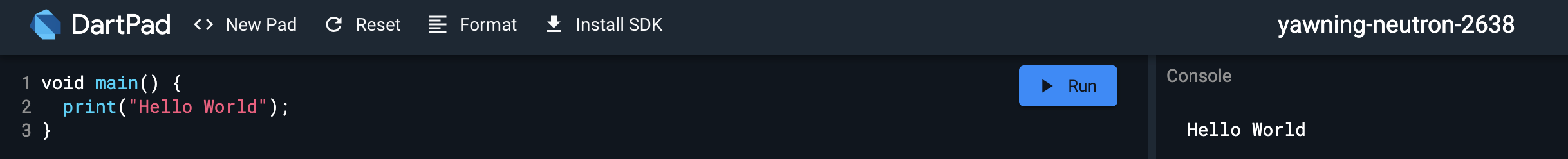 위 두가지 ide 환경에서 개발을 진행할 수 있는데, 강의를 따라가기 위하여 해당 포스팅은 [ dartpad.dev ] 를 사용하여 진행함