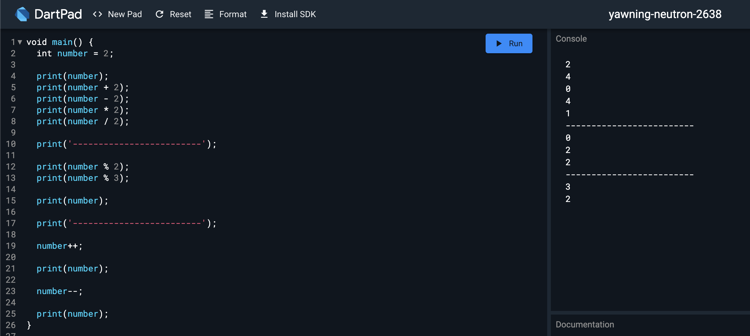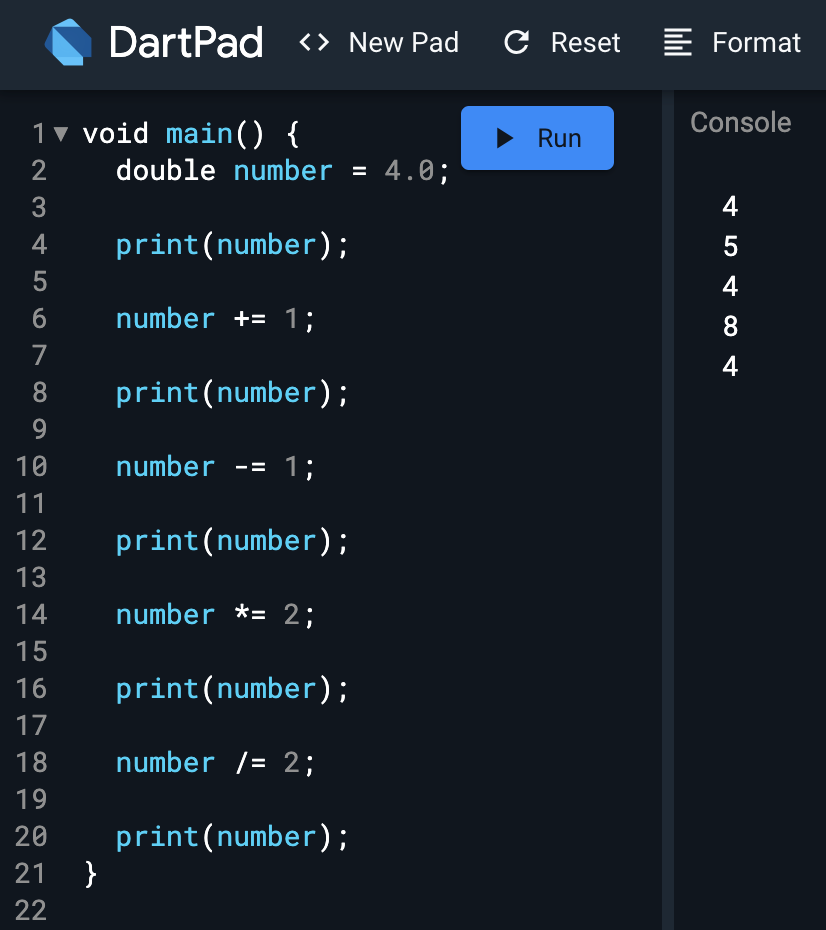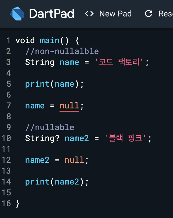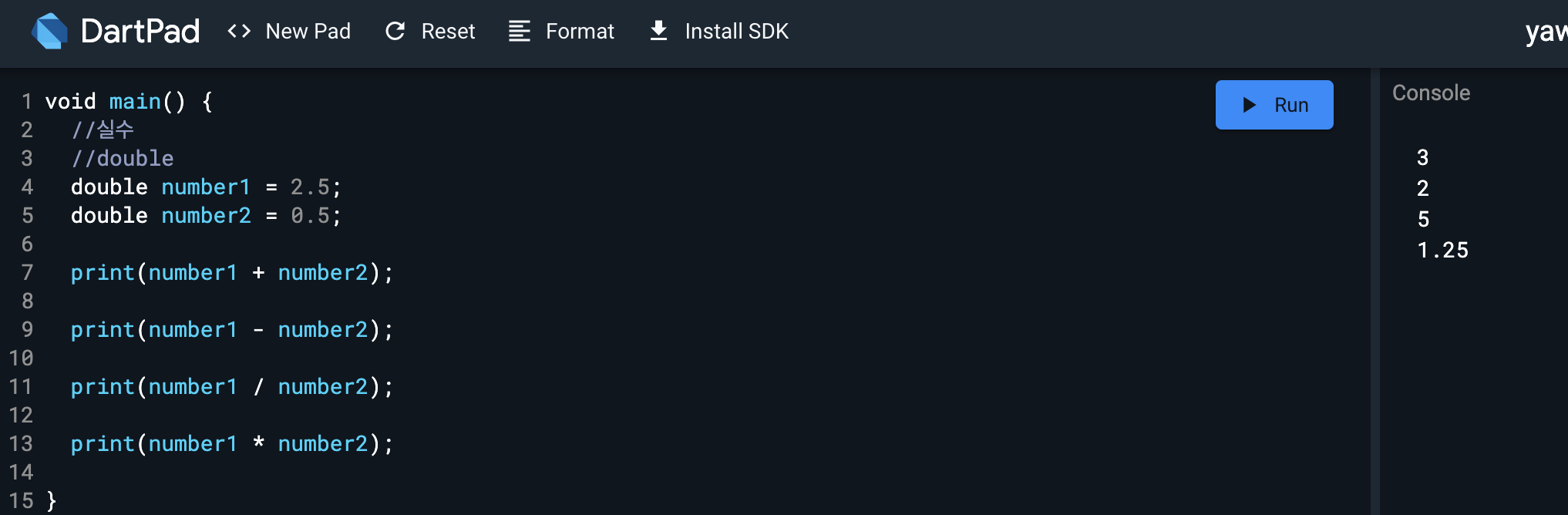 위 두가지 ide 환경에서 개발을 진행할 수 있는데, 강의를 따라가기 위하여 해당 포스팅은 [ dartpad.dev ] 를 사용하여 진행함