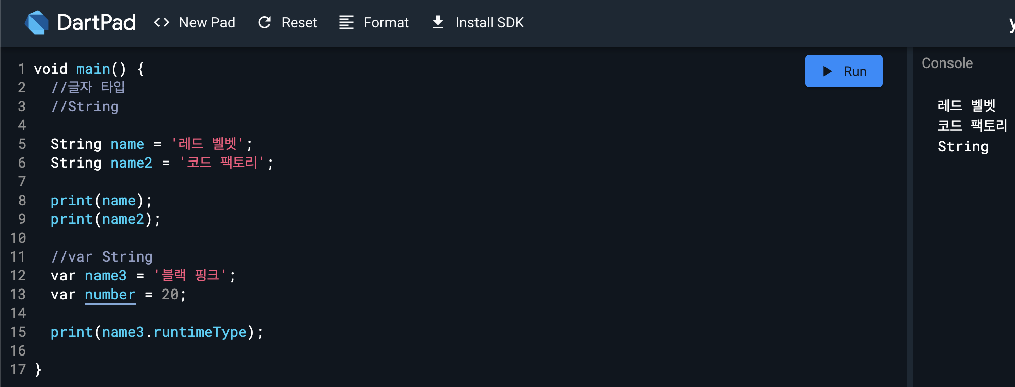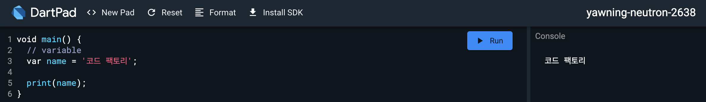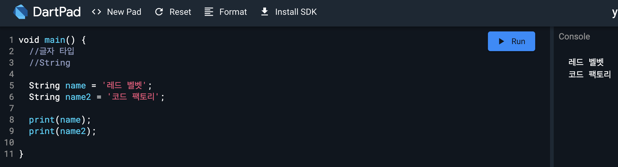 dartpad.dev 화면 내, console창에 출력된 출력문을 확인해보면 변수 선언의 순서대로 [ 코드 팩토리, 레드 벨젯, 플러터 프로그래밍 ] 이