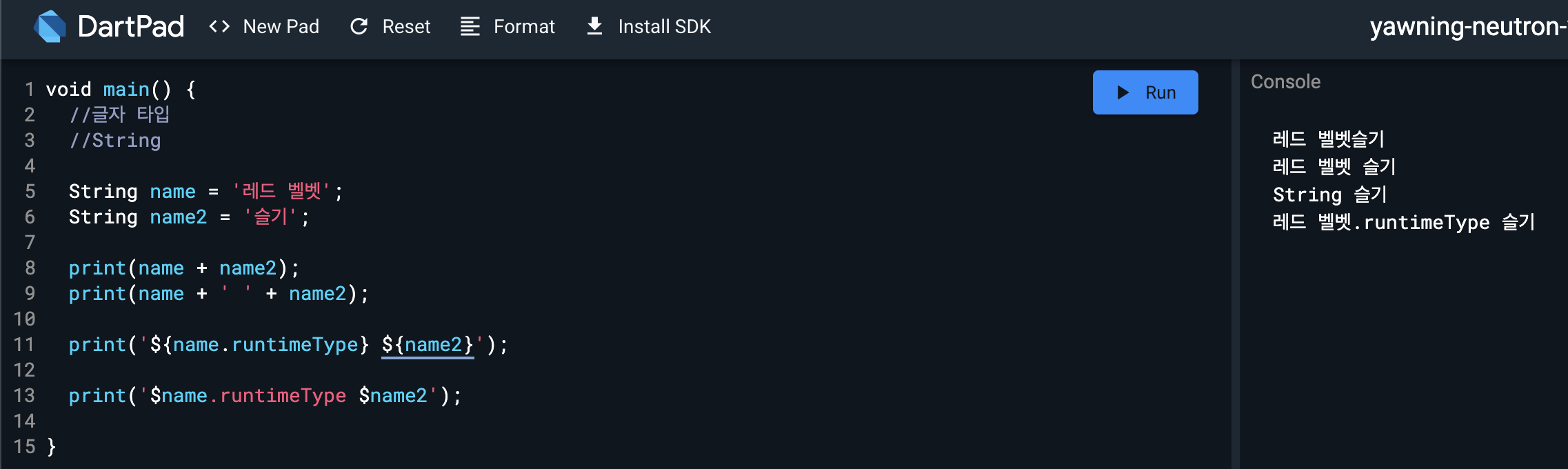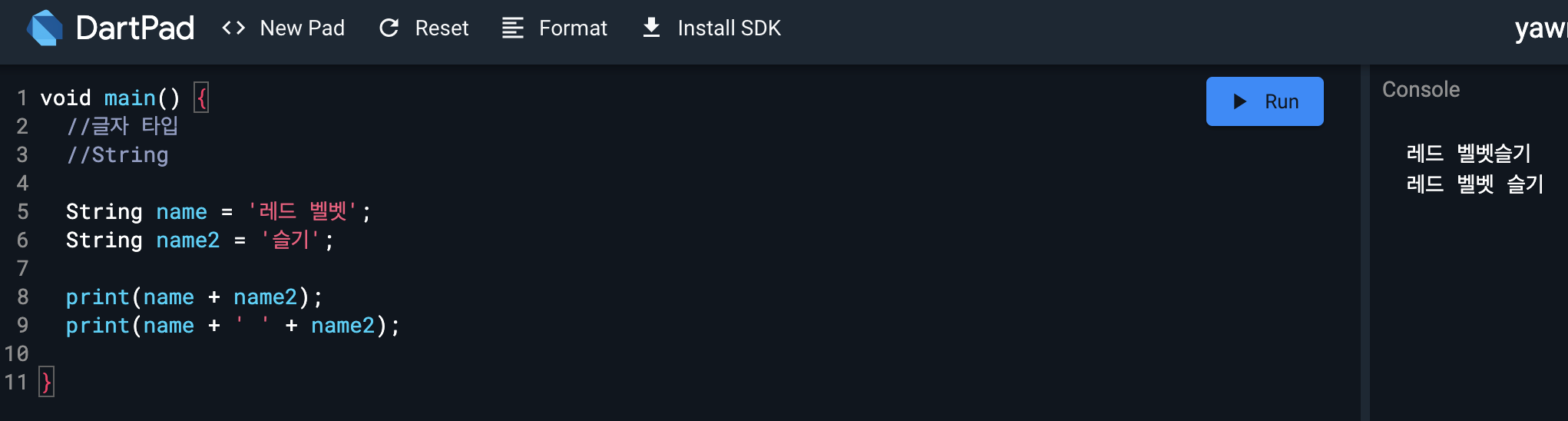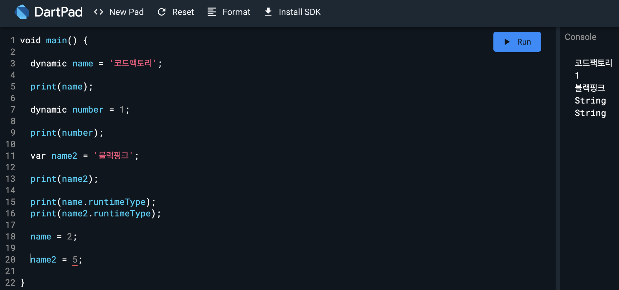 dartpad.dev 화면 내, console창에 출력된 출력문을 확인해보면 변수 선언의 순서대로 [ 코드 팩토리, 레드 벨젯, 플러터 프로그래밍 ] 이