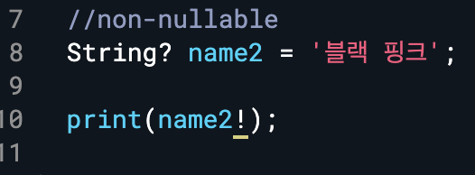 변수 뒤에 느낌표를 붙이게 될 경우, null을 허용하지 않는 변수로 사용이 가능하다