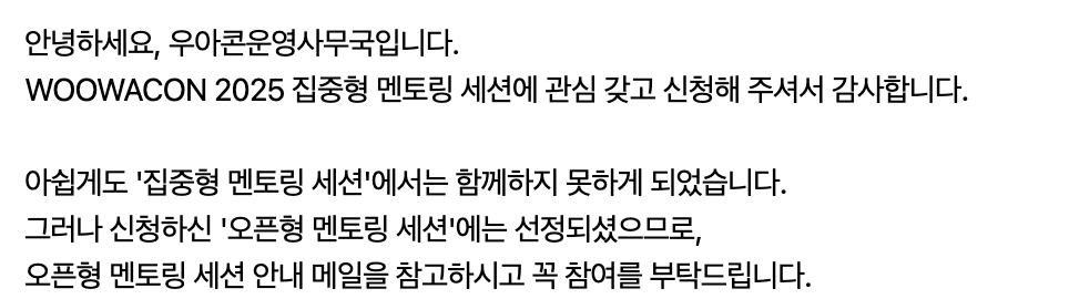 정말 감사하게도, 2025 우아콘을 참여와 더불어 '오픈형 멘토링 세션' 에도 추첨에 성공하여 11:50 - 12:30 동안 진행하는 '오픈형 멘토링: 프로젝트 성공 방정식, 협업과 커뮤니케이션 그리고 글로벌 관점'에 참가할 수 있게 되었습니다.