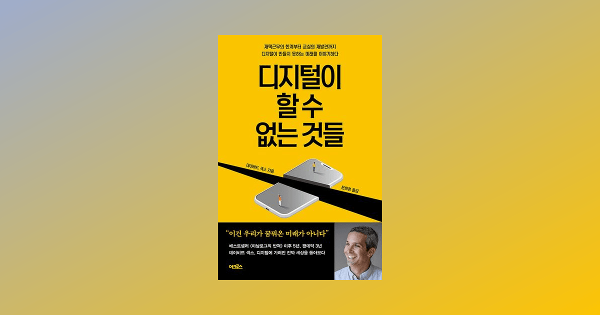 이번 독서 모임을 통해 데이비드 색스 작가님의 책을 처음 접하게 되었습니다. 이전 작품인 '아날로그의 반격'은 제목만 들어본 정도였기에, 특별한 배경지식 없이 이번 모임의 선정 도서인 '디지털이 할 수 없는 것들'을 읽게 되었습니다.